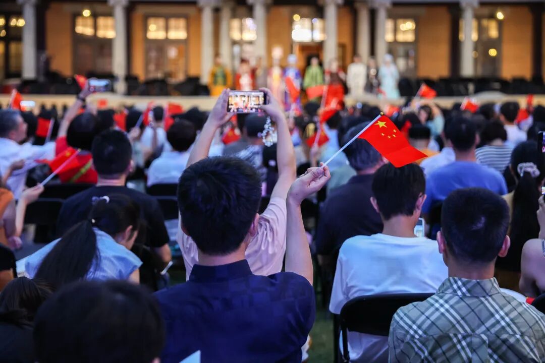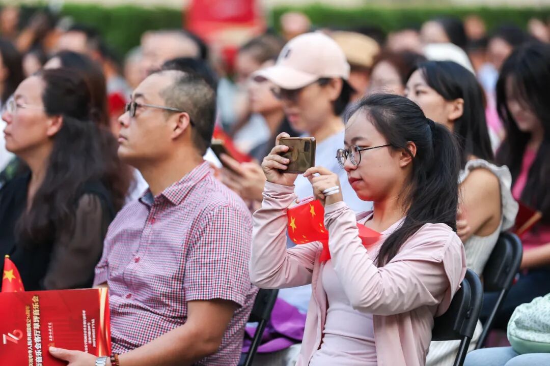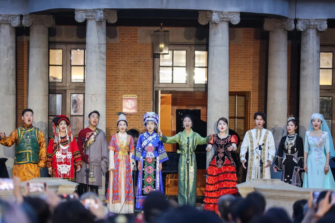 上音于2024年元旦正式面向社会公众开放。一年多以来,上音校园开放不断升级,先后举办多个主题展览、蔡元培美育大讲堂、草坪音乐会等,建设可阅读、可聆听、可感知的沉浸式开放校园,将优质艺术资源向全社会辐射,将校园文化与城市公共生活相融,助力城市文化建设,打造习近平文化思想最佳实践地。国庆期间,上音开放空间将持续供市民预约参观,并将在多处进行快闪演出。当音乐会压轴曲目《歌唱祖国》的旋律响起,现场观众在院长廖昌永的带领下,一边挥舞红旗一边齐声合唱,歌声汇聚成一股温暖而磅礴的洪流,将每一个个体与伟大的祖国紧密相连。