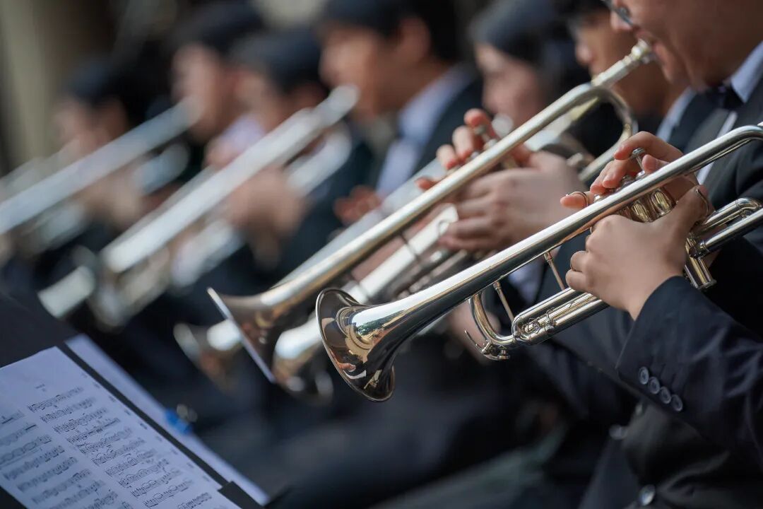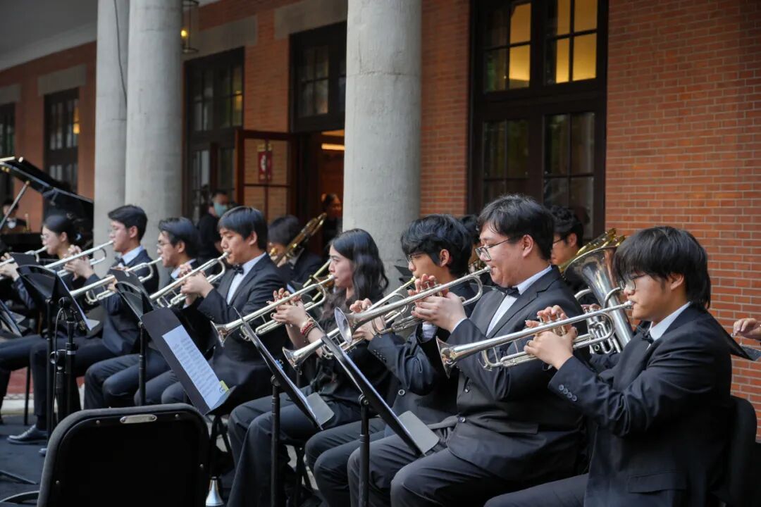 在指挥家程晔的执棒下,50余人的上海音乐学院交响管乐团以一曲气势恢宏的《红旗颂》拉开序幕,瞬间点燃现场的爱国热情。