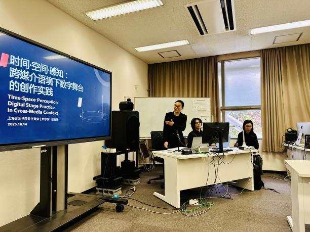 此外,陈牧声与程瑜怀分别在访问院校举办了专题学术讲座。陈牧声以《昆曲〈牡丹亭〉与我的两首管弦乐作品》为题,分享了其创作理念与文化融合的实践并与现场师生开展了互动交流;程瑜怀则围绕《时间·空间·感知:跨媒介语境下数字舞台的创作事件》展开讲述,引发在场师生的热烈讨论与互动。