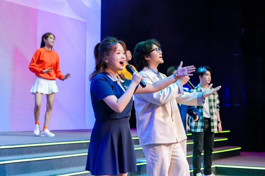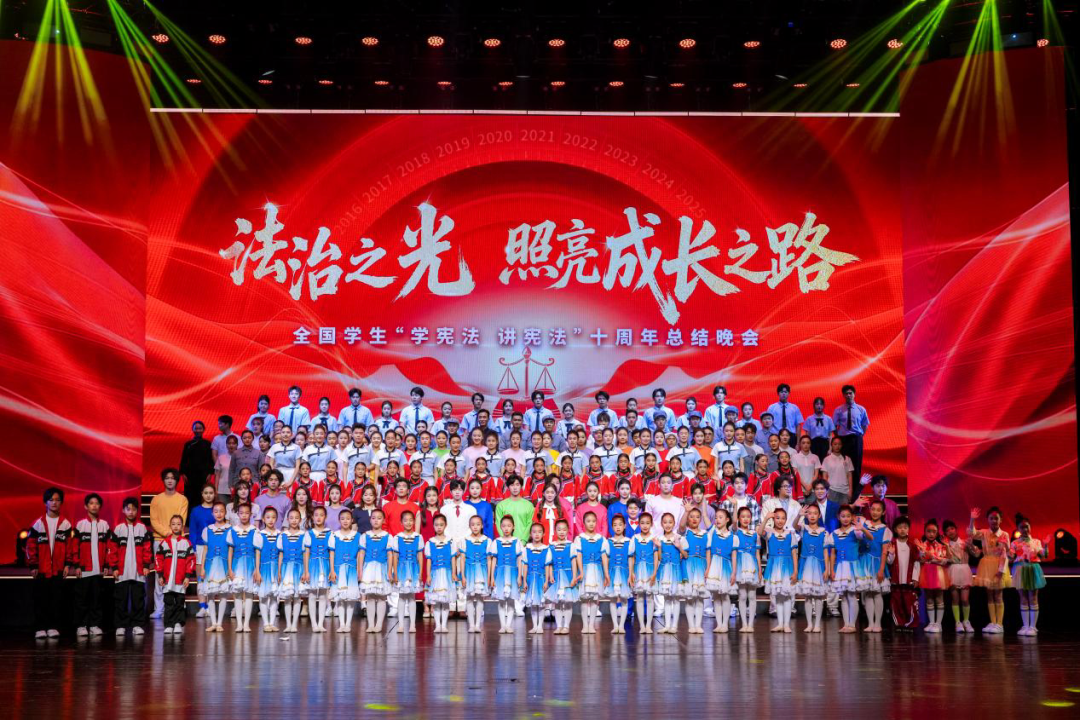 第三篇章“法治筑梦 薪火相传”结尾,音乐戏剧系赵子桢、张凌恺与孩子们共同演绎歌曲《宪法伴我成长》,温暖的歌声与童声交融,生动刻画了宪法如挚友般陪伴青少年成长的画面。