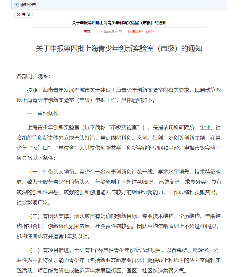 第四批上海青少年创新实验室(市级)申报(2025年)