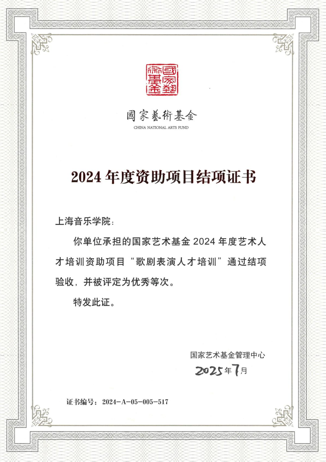 国家艺术基金2024年度艺术人才培训资助项目“歌剧表演人才培训”以优秀等次结项
