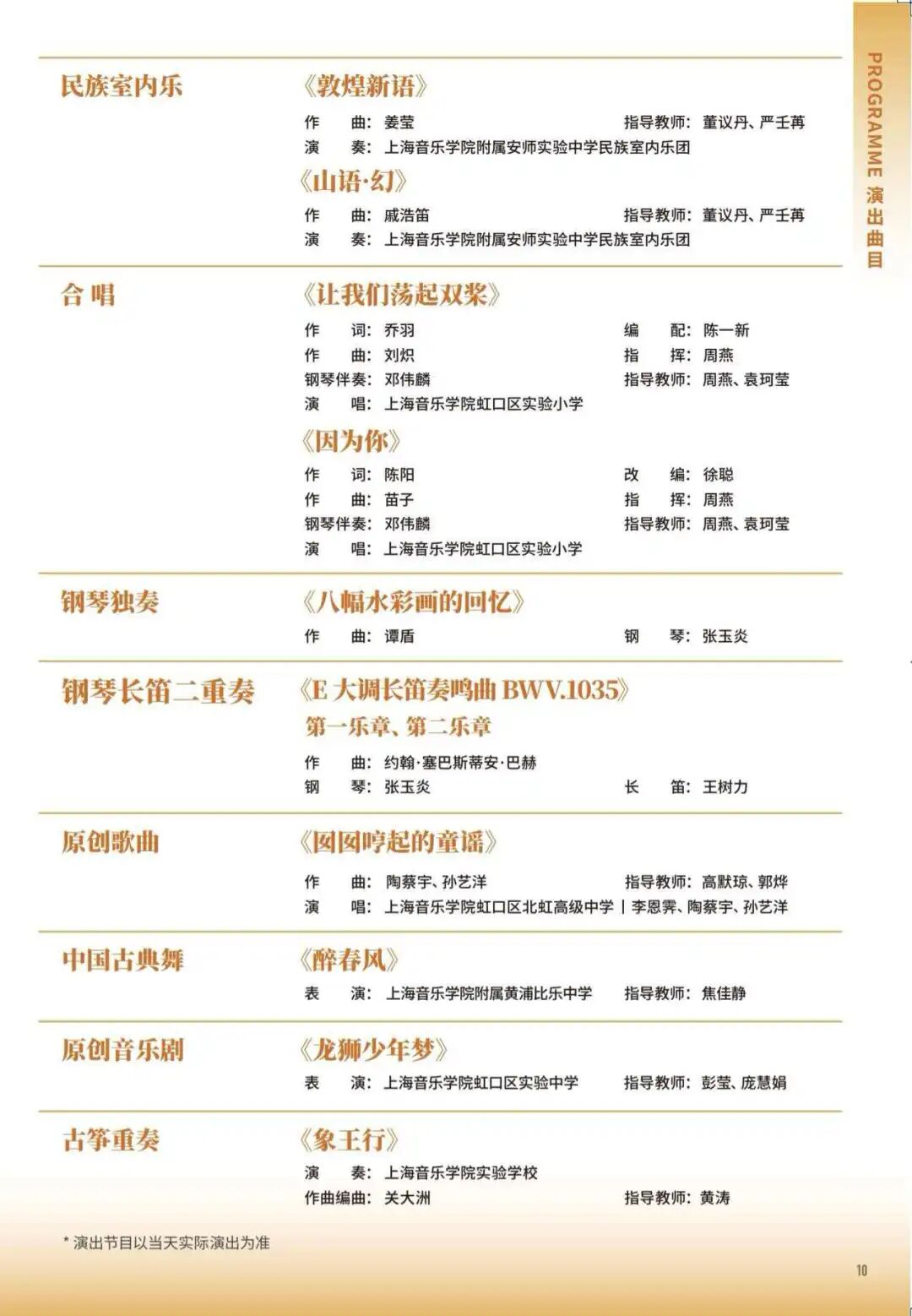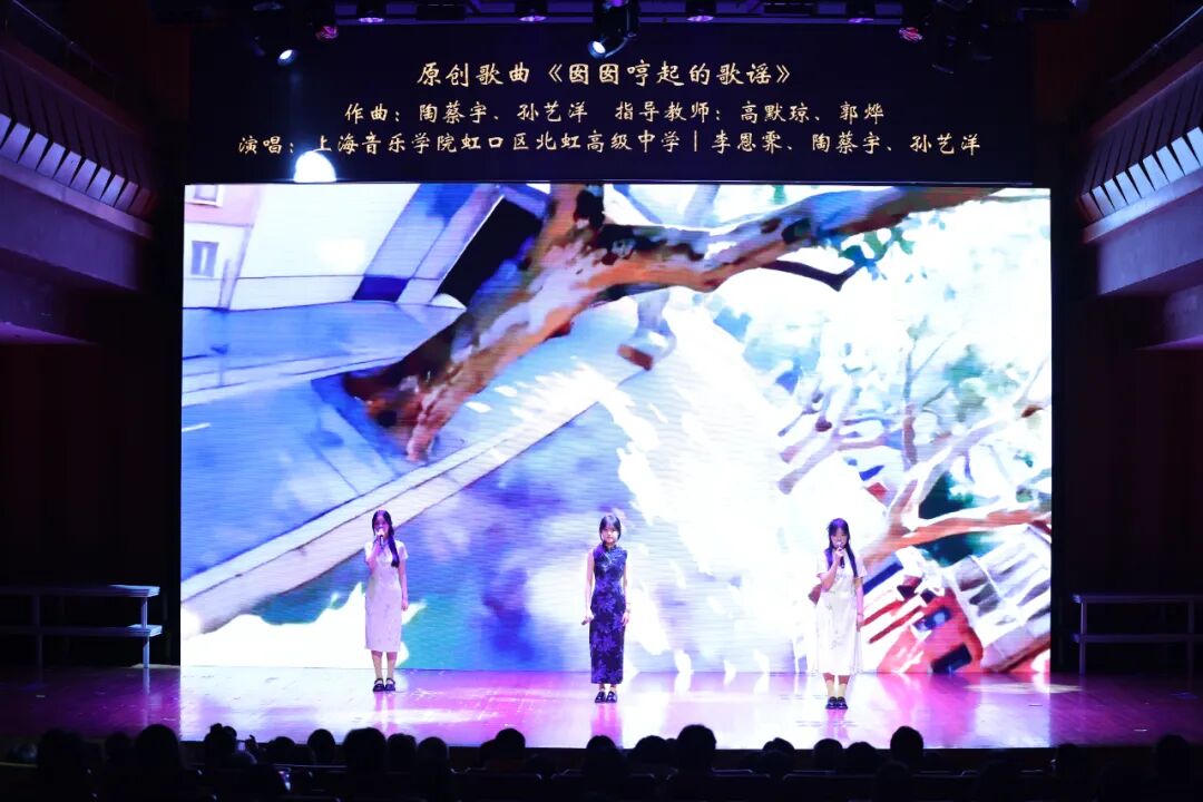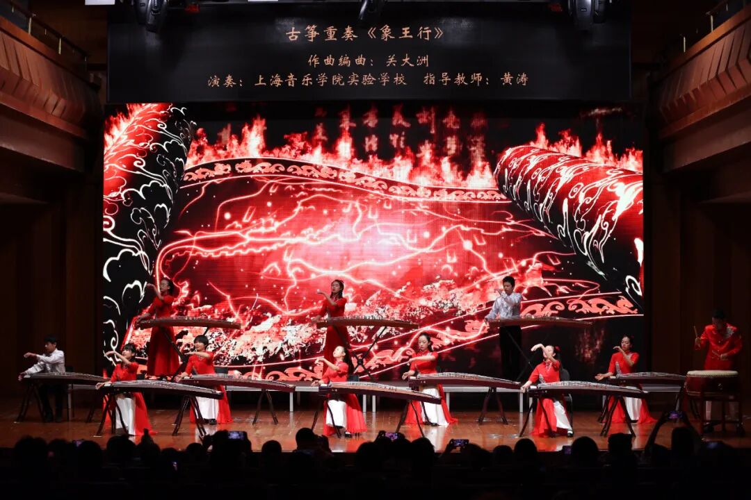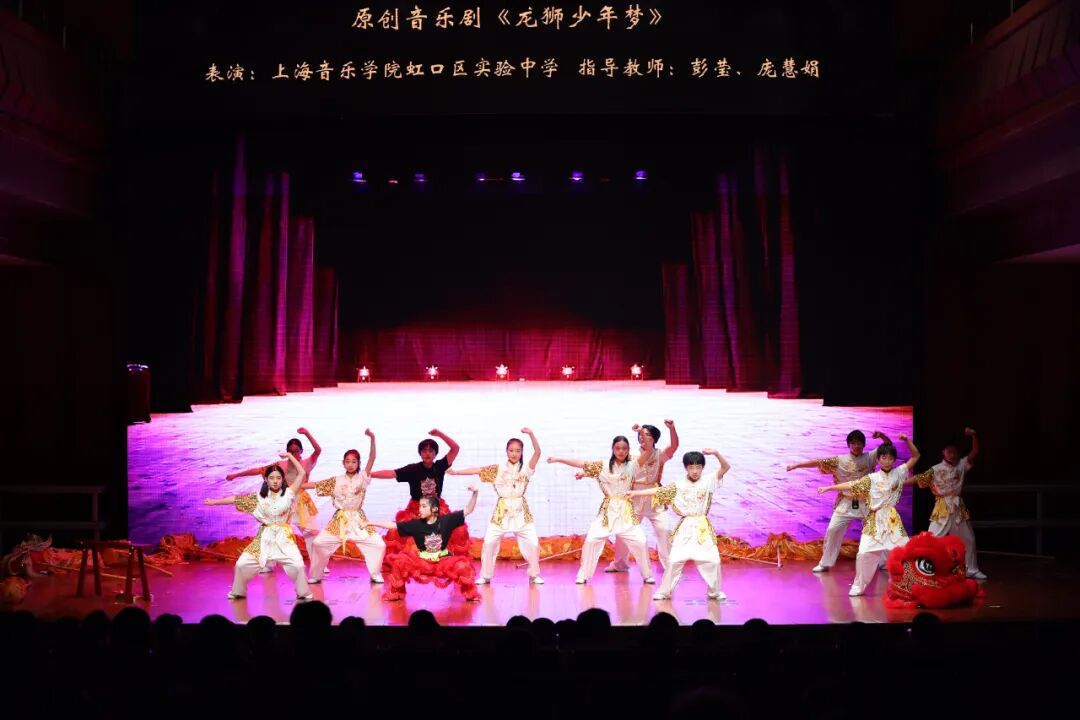 随后,多部由合作学校师生原创或改编的优秀作品依次亮相。上海音乐学院虹口区北虹高级中学原创歌曲《囡囡哼起的童谣》融入江南与海派风格,并由上音北虹音创班学生参与创作。上海音乐学院虹口区实验中学原创音乐剧《龙狮少年梦》片段,以鲜活的舞台表达展现中国优秀传统文化。终曲《象王行》由上海音乐学院实验学校古筝团呈现,呈现东方音乐的雅韵与神采。