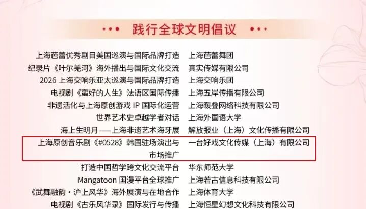 近日,2025年度上海市“中华文化国际传播”、“银鸽之光”第二十届上海市国际传播优秀项目征集活动结果公布。上海音乐学院申报项目“南韵·国色——新媒体音乐会”“庆祝中国与尼泊尔建交70周年系列活动”入选“银鸽之光”优胜项目;上音人执导上海原创音乐剧《#0528》韩国驻场演出与市场推广入选“中华文化国际传播”项目。