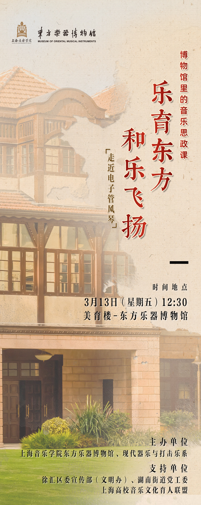 3月13日(星期五)中午12点30分,相约上海音乐学院东方乐器博物馆(淮海中路1209号美育楼),在电子管风琴的乐声里,聆听时代旋律,感悟美育力量,共赴一场音乐与思政的美好相遇。