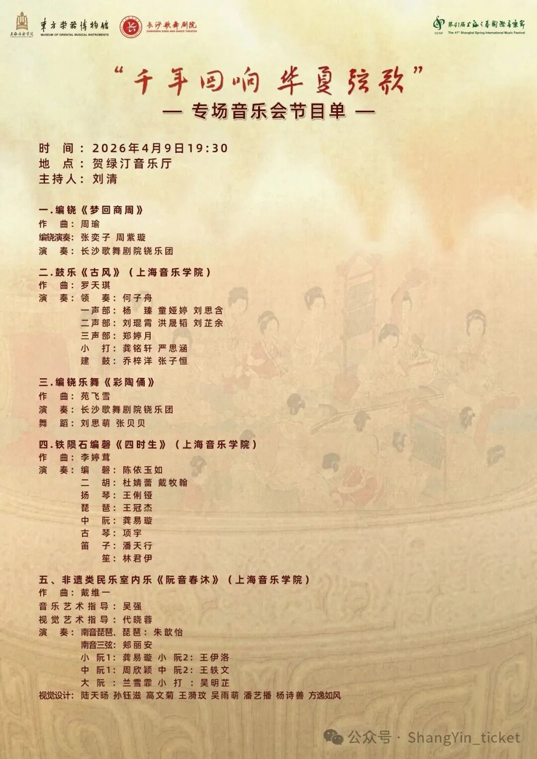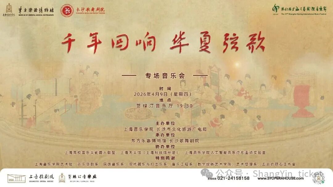 当编铙的青铜余音穿越三千年,当竹笛的清越吹响浏阳河的浪涛,当非遗民乐与古乐新声在舞台相遇——上海音乐学院东方乐器博物馆携手长沙歌舞剧院,联袂为您奏响一场跨越时空的华夏乐章。