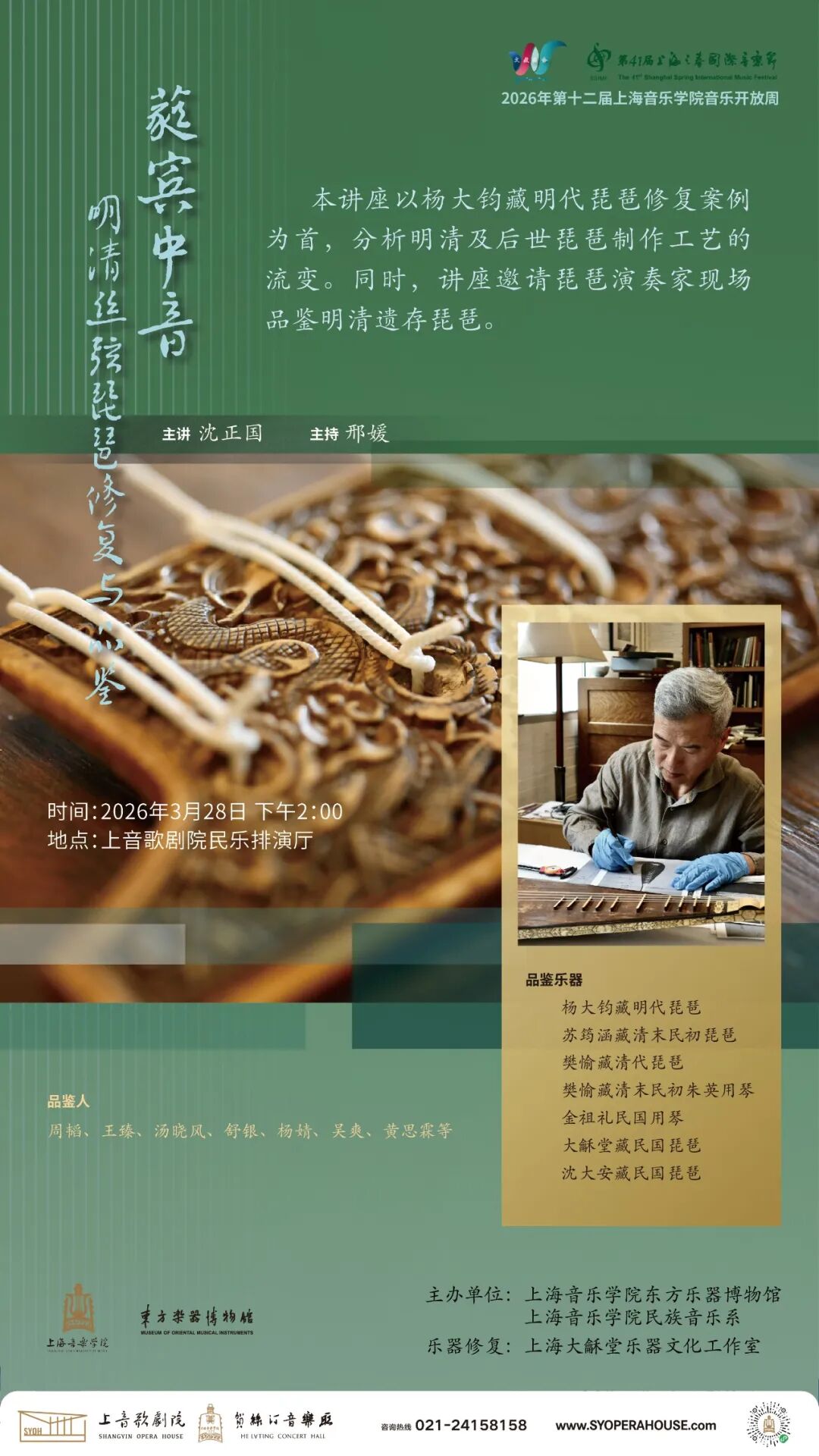 本场活动由上海音乐学院东方乐器博物馆、民族音乐系联合主办,上海大龢堂乐器文化工作室提供乐器修复专业支持,是本届上音开放周场馆活动的特色之一,集技艺分享、珍琴陈列、名家品鉴于一体,全方位展现明清琵琶的传世之美。