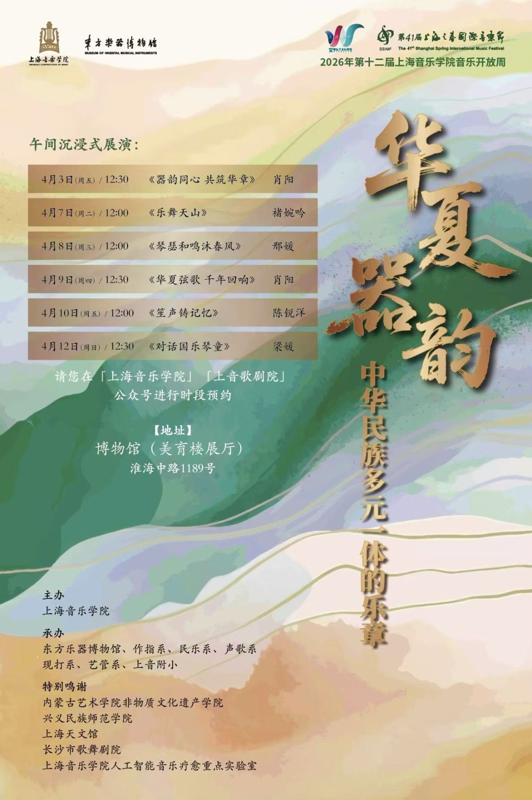 2026年3月至4月,第十二届上海音乐学院音乐开放周拉开序幕,东方乐器博物馆、校史馆作为主体场馆之一,依托上音校园开放,携手校内各院系聚焦中华民族多元音乐,结合人工智能科技元素,推出系列讲座、展演、音乐会、互动体验项目等,诚邀广大乐迷与文化爱好者预约参与。
