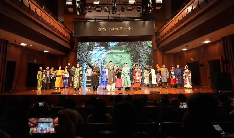 音乐会后半程,《北京的金山上》《崴萨啰》《酒歌》等歌曲联唱轮番上演,各民族欢歌热舞接连呈现,现场气氛热烈非凡。全体演员与观众齐声合唱《母亲是中华》,将音乐会推向情感高潮,“五十六个民族亲亲一家,就像百花园里盛开的花”的铿锵旋律,唱出了各民族儿女对祖国母亲的赤诚热爱,诠释了各民族像石榴籽一样紧紧抱在一起的紧密联结,让铸牢中华民族共同体意识的理念在歌声中深深扎根。